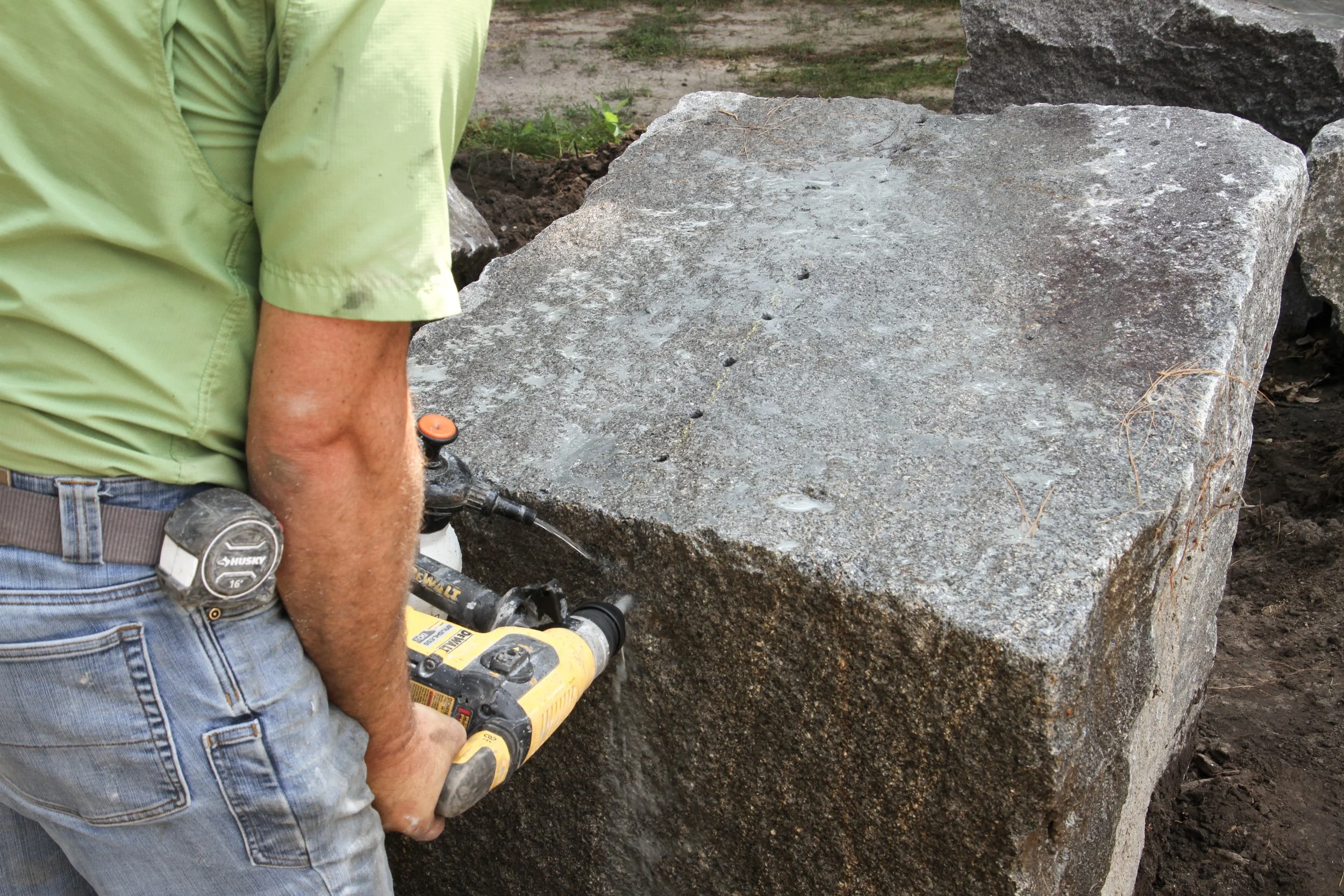 To split large rocks during projects, we use the feather and wedge technique. First, a series of holes are drilled into the rock, typically following a natural seam to guide the split. Into these holes, small feather and wedge tools are inserted. By pounding the wedges, they exert pressure on the feathers, gradually causing the rock to split along the desired line. This method allows us to manage and position large rocks effectively.